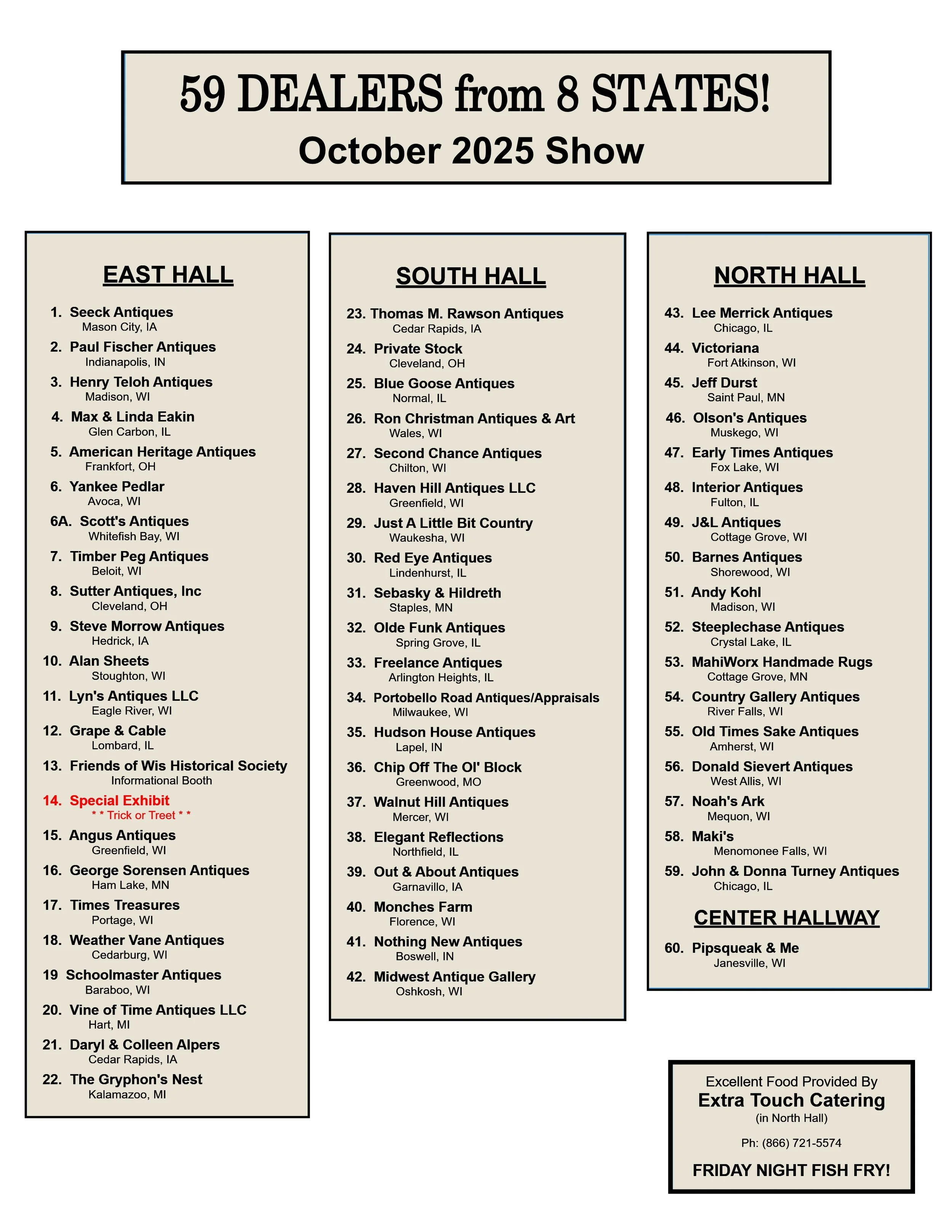 74th FALL Wisconsin Antiques Dealers Association ShowFriday, October 3 & Saturday, October 4, 2025Waukesha Expo Center, Waukesha, Wisconsin