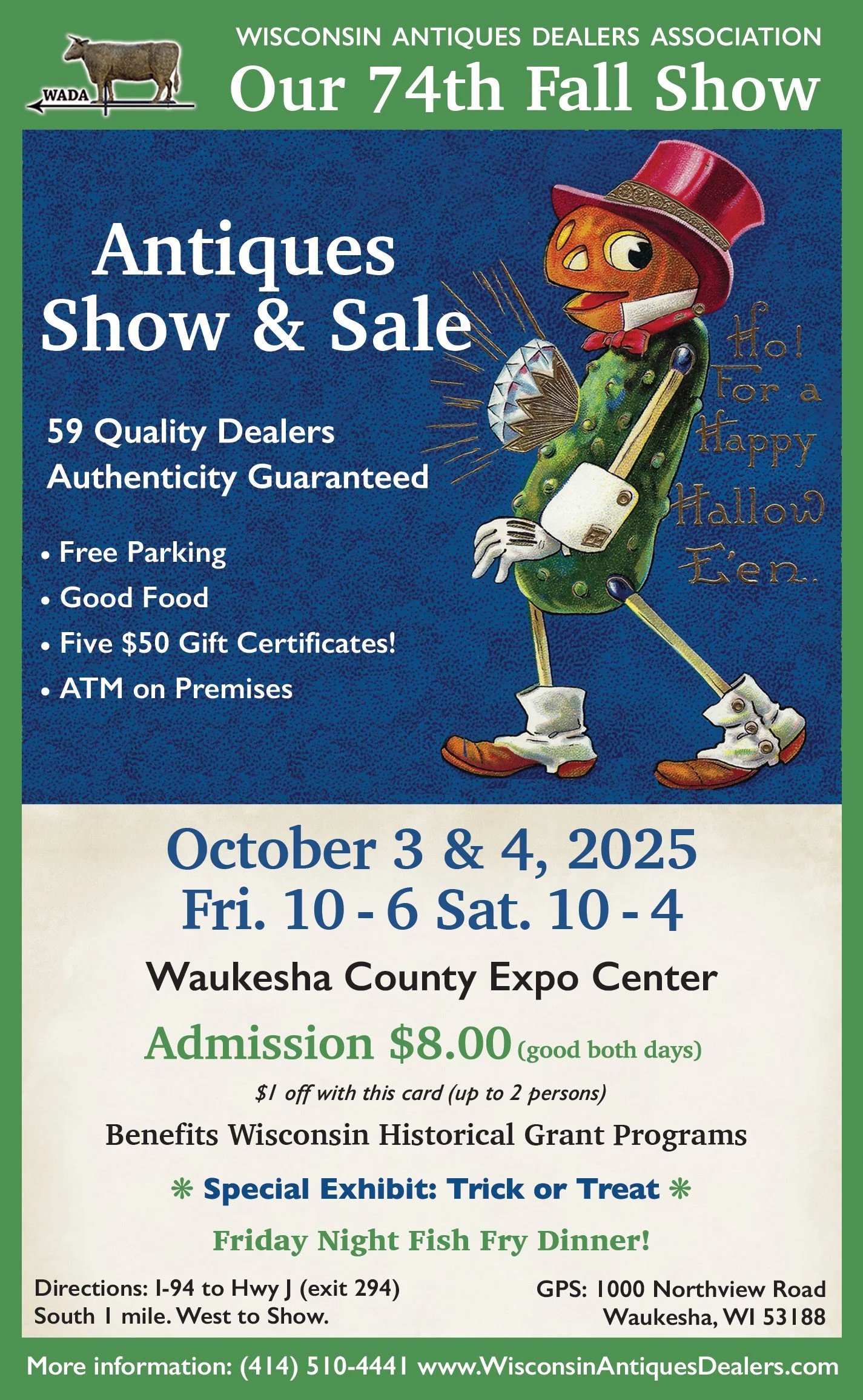 74th Fall Wisconsin Antiques Dealers Association Show and SaleFriday & Saturday, Otober 3 & 4, 2025Waukesha County Expo Center, Waukesha, Wisconsin
